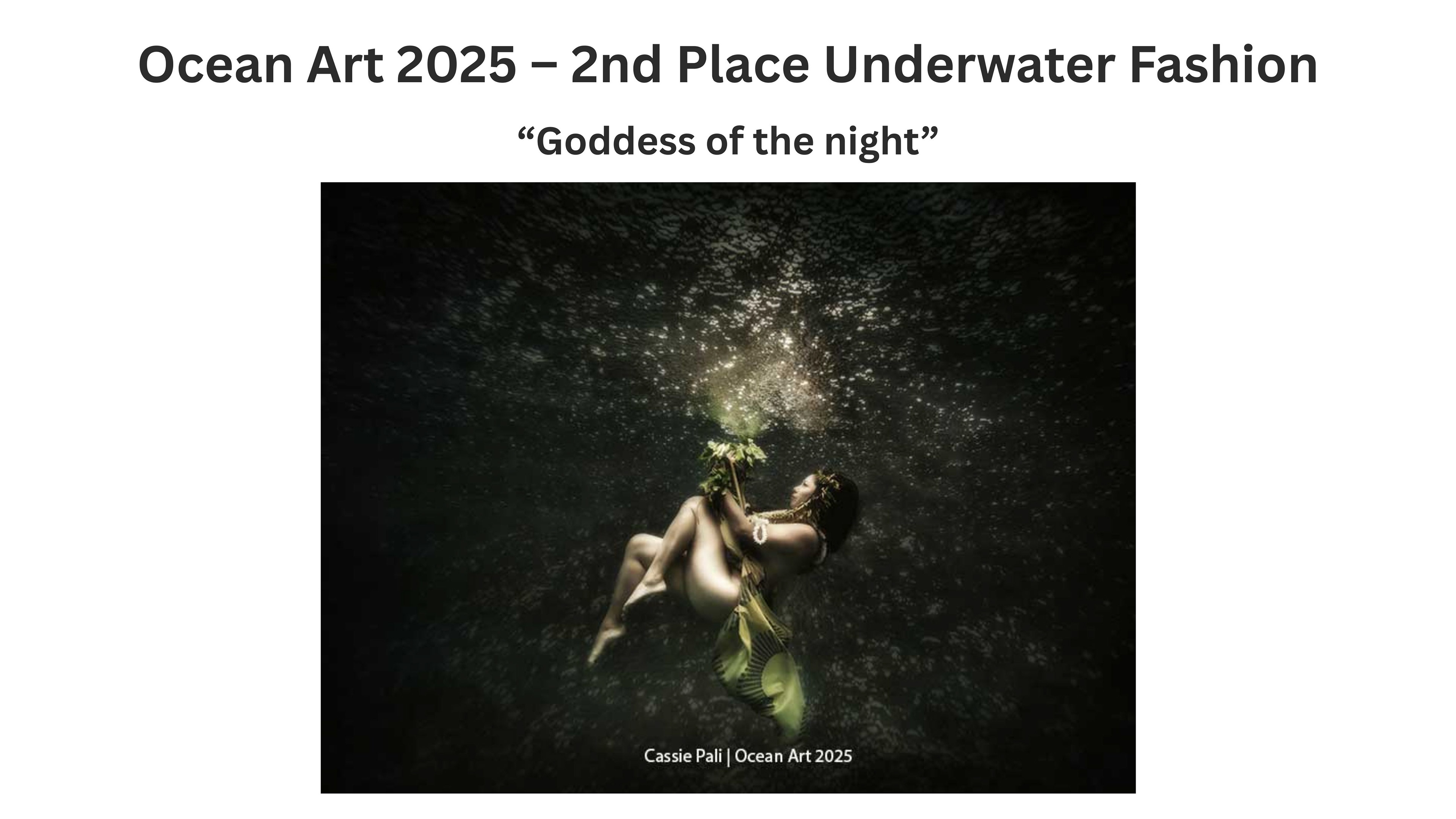 My work has been honored internationally. I received 1st Place at the Spiritual Art Awards three years in a row 2019, 2020, 2021. Most recently, I was awarded 2nd Place at the Ocean Art 2025, an internationally recognized underwater photographic competition, for my piece Goddess of the Night.